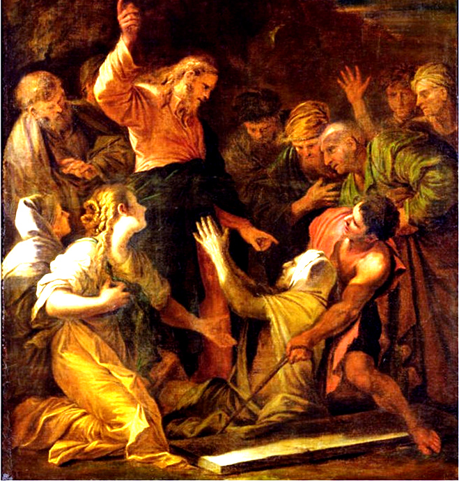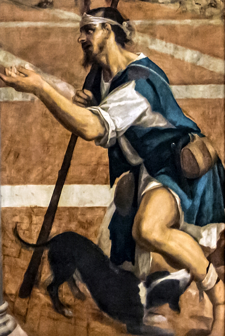 A beggar named Lazarus lay at the gate of the rich man's house, covered with sores. He hoped to fill his stomach with what was left over from the rich man's table, but only dogs came and licked his sores. One day the beggar died and was carried away by the angels to rest at Abraham's side (Luke 16:20-22).