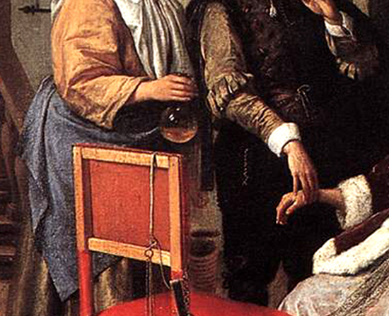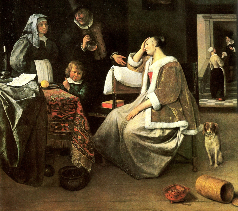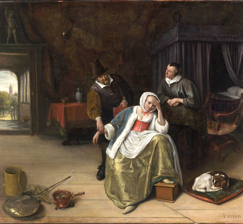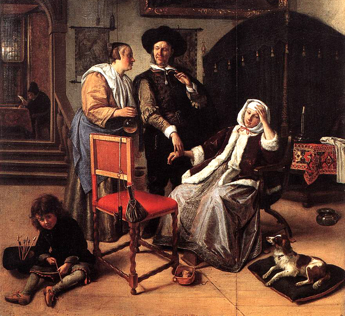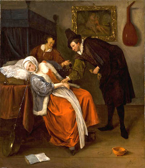 Jan Steen painted more than forty different versions of a doctor's visit, each featuring an elderly doctor examining a glass bottle of urine delivered by the patient, usually a young woman lying stretched out in bed or resting on cushions in a chair.