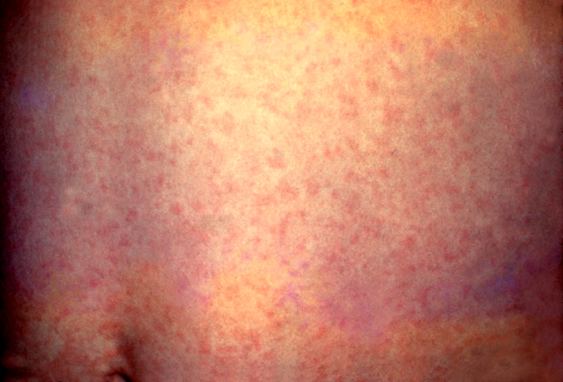 Main symptoms: Fever, measles-like rash, vasospasms on the face and legs.