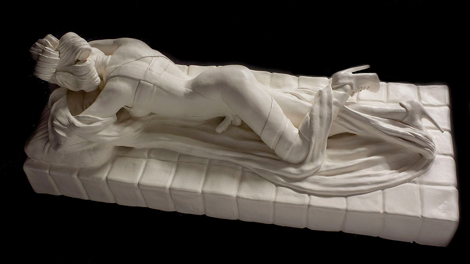 Next to her stands a pedestal with a spinning wheel and a snail on top; the former refers to