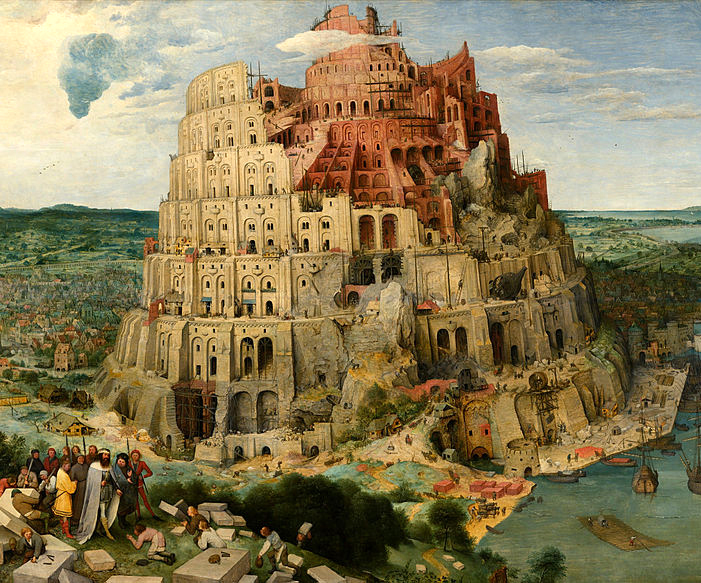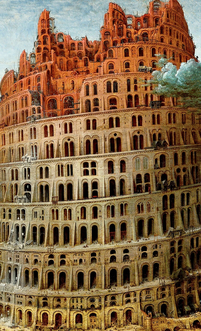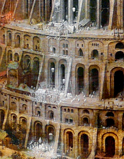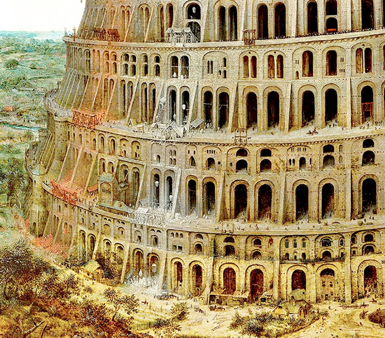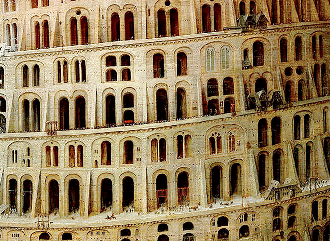 In Bruegel’s painting, the tower can be seen rising beyond the clouds, literally reaching up to heaven. On and around the tower, activity swarms everywhere. Countless people are busy constructing the tower.