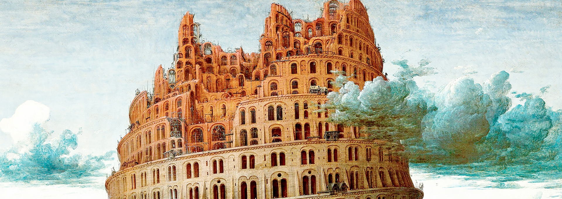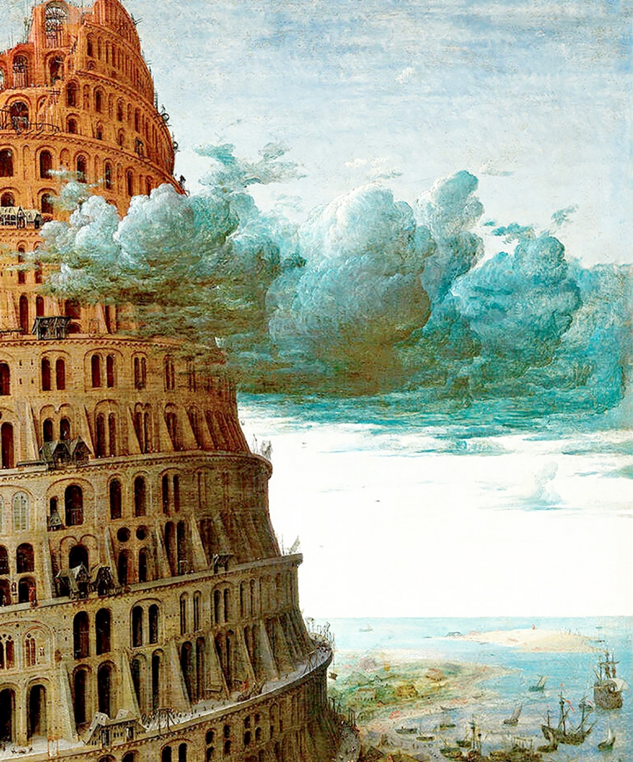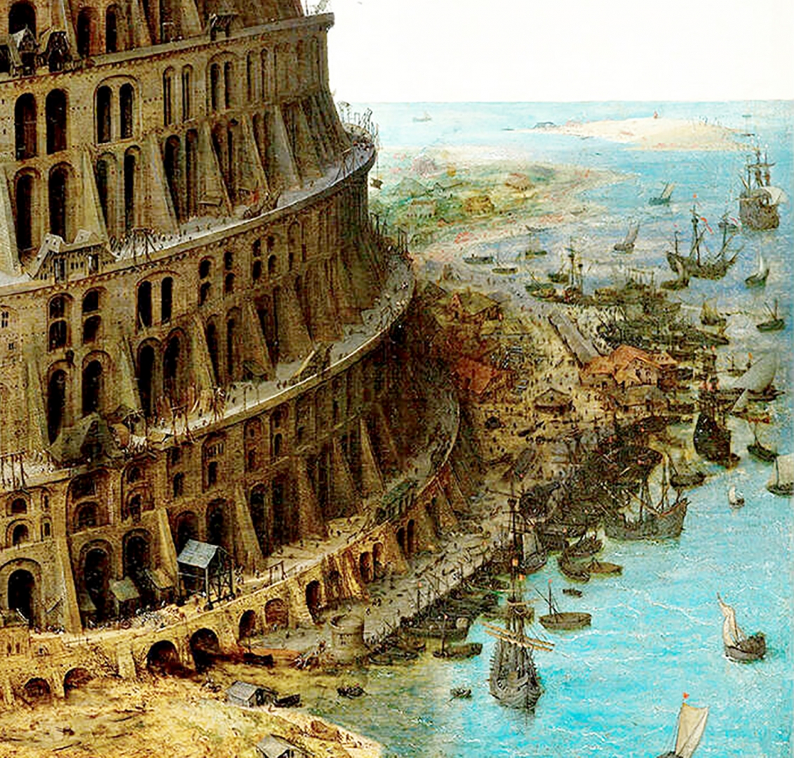 In Bruegel’s painting, the tower can be seen rising beyond the clouds, literally reaching up to heaven. On and around the tower, activity swarms everywhere. Countless people are busy constructing the tower.