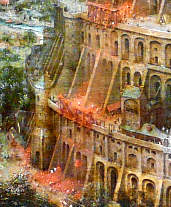 On the painting, however, the work has not reached that point yet—they are still hard at work. The discoloration of the tower shows that construction has been going on for a long time.