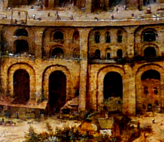 The lower part of the Tower of Babel is inspired by the rounded arches of the Colosseum in Rome.