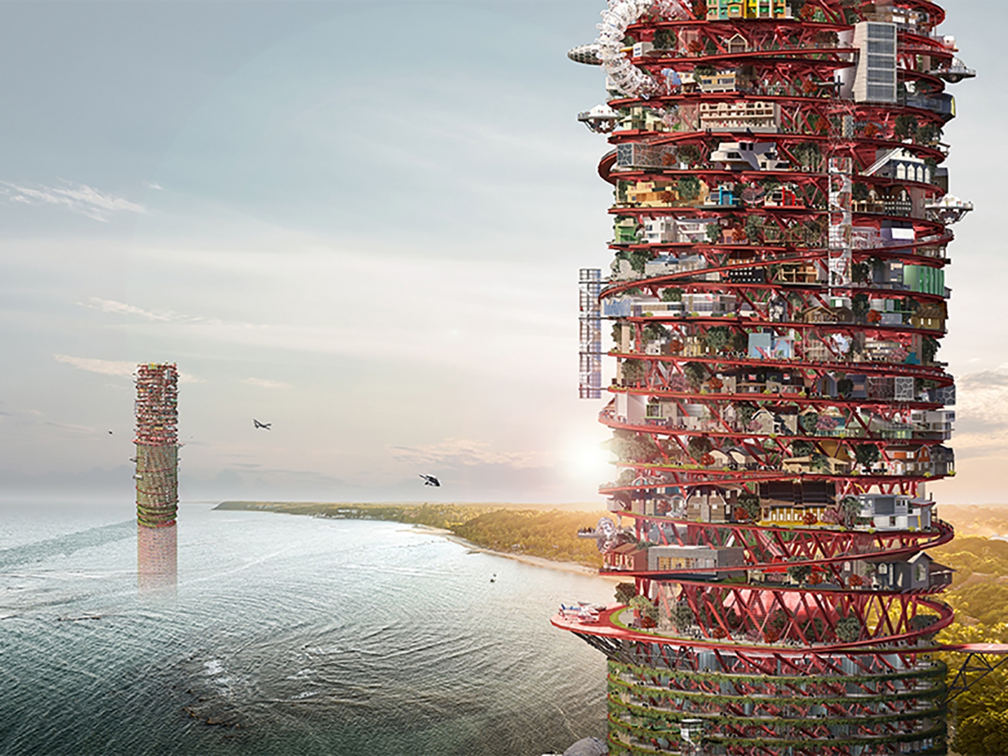 On the third level of the tower, a procession is taking place, and one floor below, riders are on their way upward.