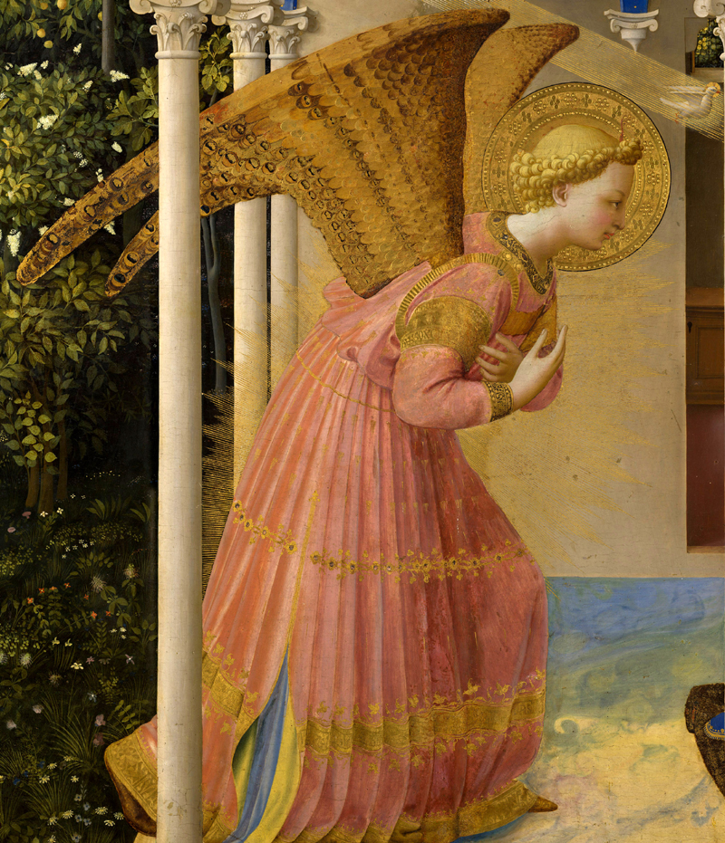 As is often the case in depictions of this theme by Italian painters, the event takes place in a loggia. The Gospel vaguely refers to ‘Mary's house’; the angel Gabriel has just arrived. Inscriptions between the angel and Mary (who has a prayer book on her lap) reflect the essence of the conversation we read about in Luke. Mary's posture, leaning towards the angel, her hands folded on her chest, testifies to her humble consent.