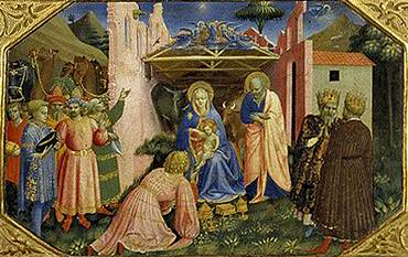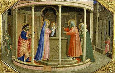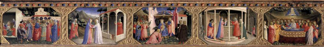 The five scenes depicted on the predella (pedestal) depict important moments in Mary's life: her birth and marriage, the Visitation, the meeting between Mary and her cousin Elizabeth, who was pregnant with John the Baptist, the adoration of Jesus by the three wise men or kings from the East, Mary's dedication or presentation in the temple, and Mary's death. We read nothing about Mary's birth, dedication, and death in the canonical Gospels, but we do in apocryphal texts.