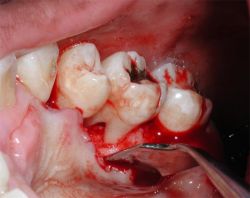 Bone loss from aggressive periodontitis that led to an exposed furcation on an upper molar.