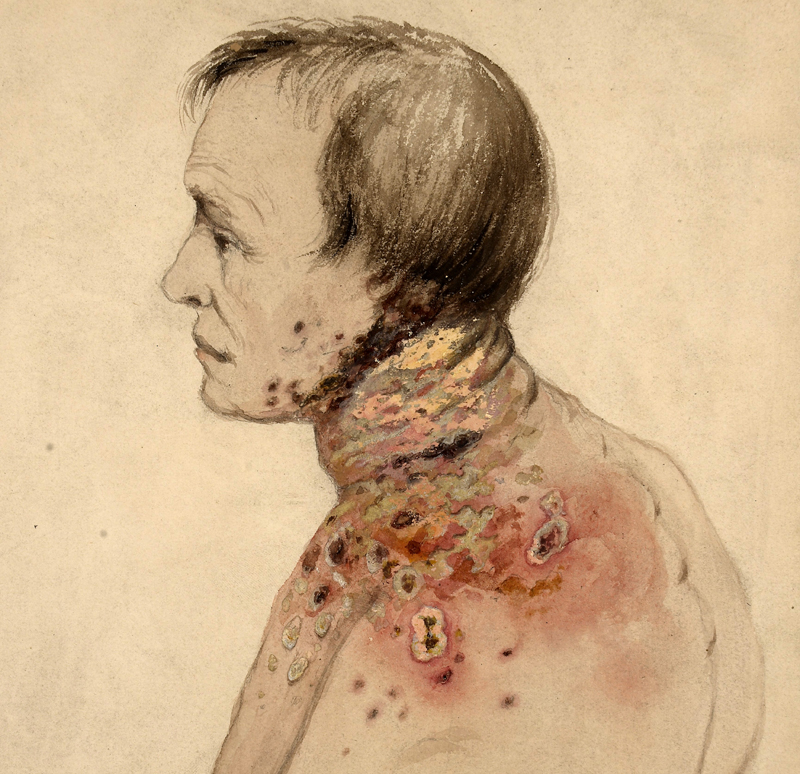 Significant symptoms: Scar on the left side of the face, retracted lower eyelid on the left, atrophied jaw muscles, toothless mouth, bent posture of the head. (Pain?)