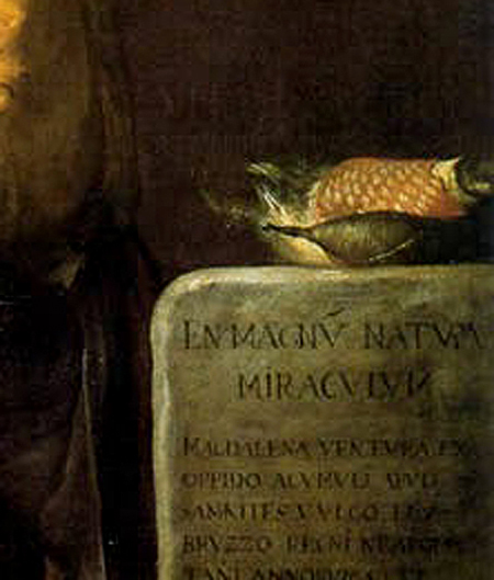 her domestic duties, the latter is a symbol of hermaphroditism. On the pedestal is a Latin text telling the story of Magdelena, which begins with the words: ‘En Magna naturae miraculum’ (behold a great miracle of nature).