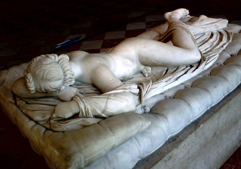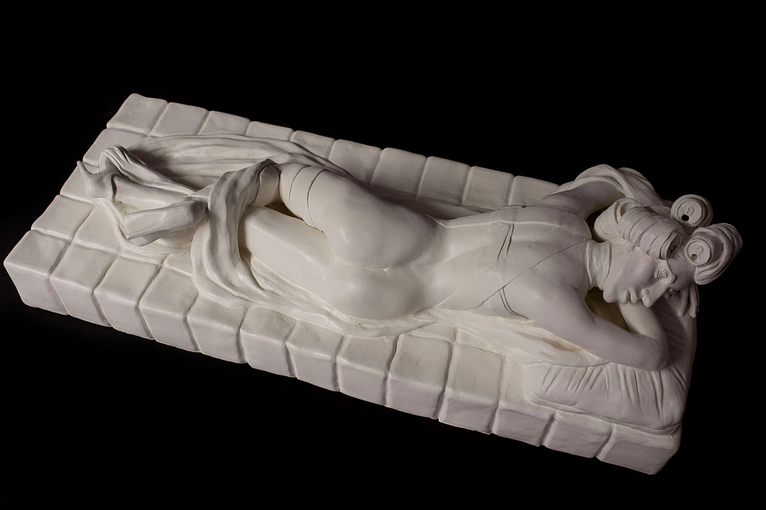 Next to her stands a pedestal with a spinning wheel and a snail on top; the former refers to