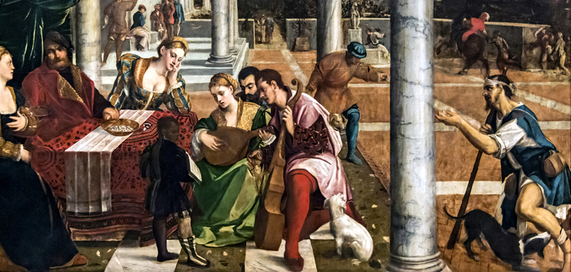 A beggar named Lazarus lay at the gate of the rich man's house, covered with sores. He hoped to fill his stomach with what was left over from the rich man's table, but only dogs came and licked his sores. One day the beggar died and was carried away by the angels to rest at Abraham's side (Luke 16:20-22).