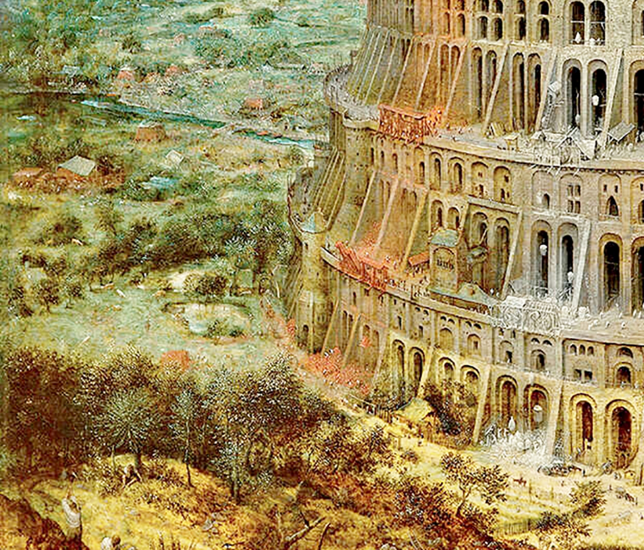 In Bruegel’s painting, the tower can be seen rising beyond the clouds, literally reaching up to heaven. On and around the tower, activity swarms everywhere. Countless people are busy constructing the tower.