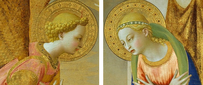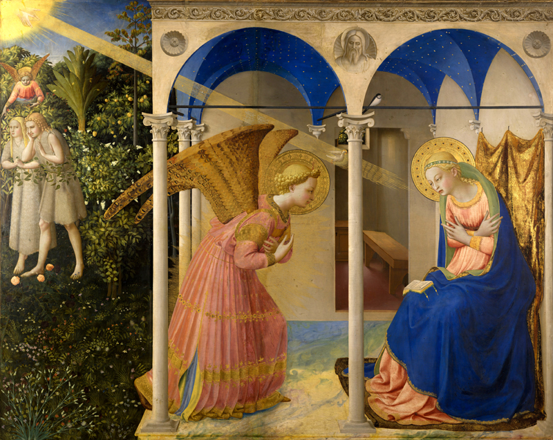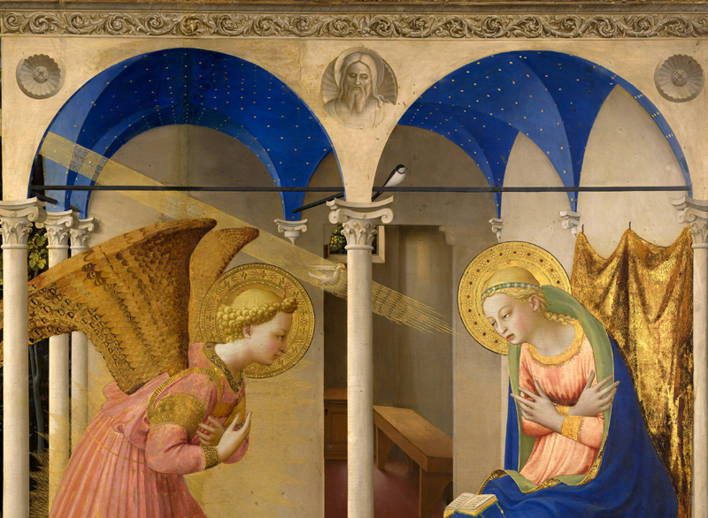 As is often the case in depictions of this theme by Italian painters, the event takes place in a loggia. The Gospel vaguely refers to ‘Mary's house’; the angel Gabriel has just arrived. Inscriptions between the angel and Mary (who has a prayer book on her lap) reflect the essence of the conversation we read about in Luke. Mary's posture, leaning towards the angel, her hands folded on her chest, testifies to her humble consent.
