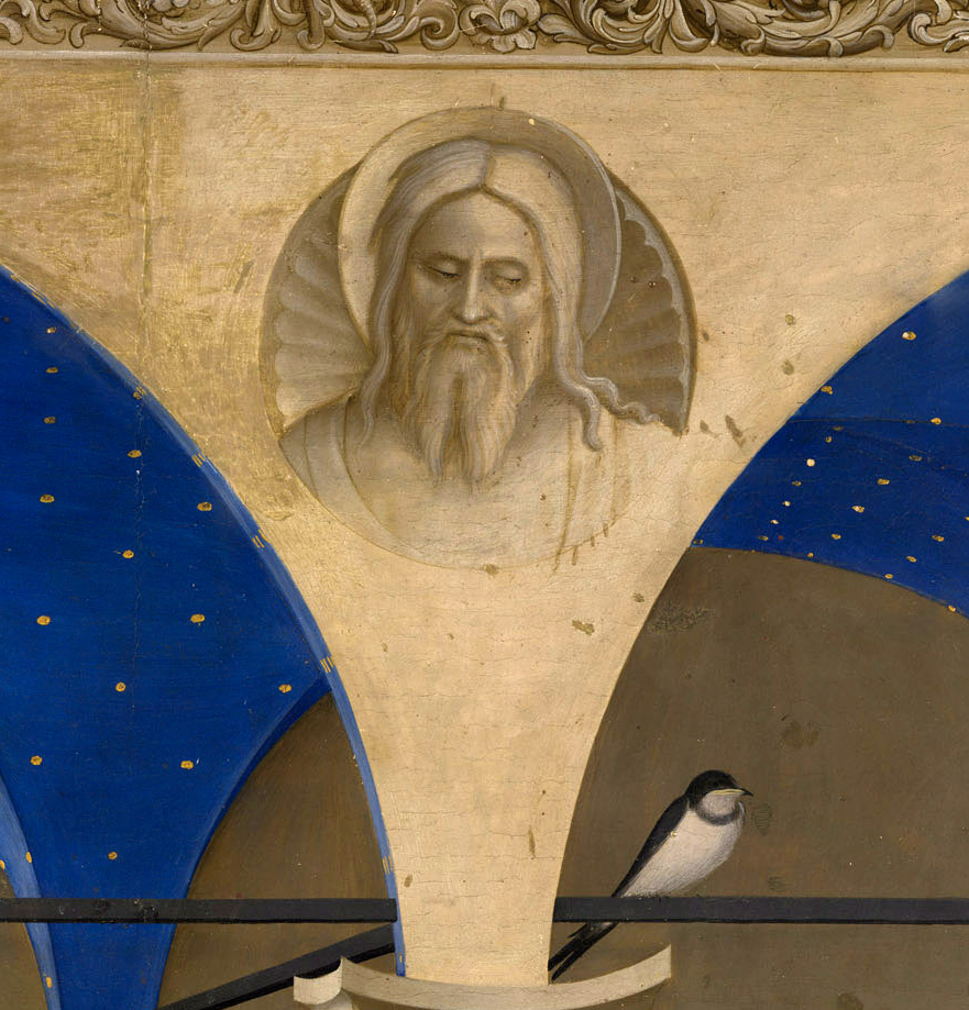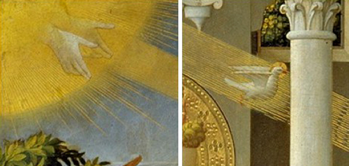 God, the source of light, sends down a dove. The bird symbolizes the Holy Spirit and penetrates the beam of light to reach Mary. Simultaneously with the announcement of Christ's coming, the spiritual conception of Mary—that is, the incarnation of Jesus—takes place. The image of God the Father himself is incorporated into the architecture like a medallion.