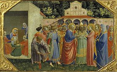 The five scenes depicted on the predella (pedestal) depict important moments in Mary's life: her birth and marriage, the Visitation, the meeting between Mary and her cousin Elizabeth, who was pregnant with John the Baptist, the adoration of Jesus by the three wise men or kings from the East, Mary's dedication or presentation in the temple, and Mary's death. We read nothing about Mary's birth, dedication, and death in the canonical Gospels, but we do in apocryphal texts.